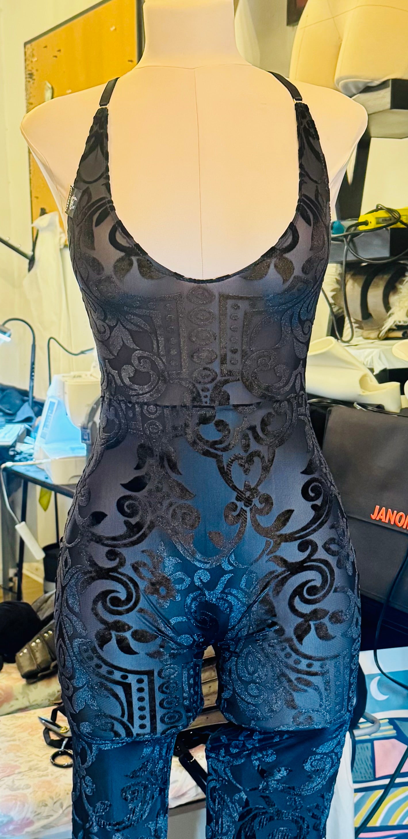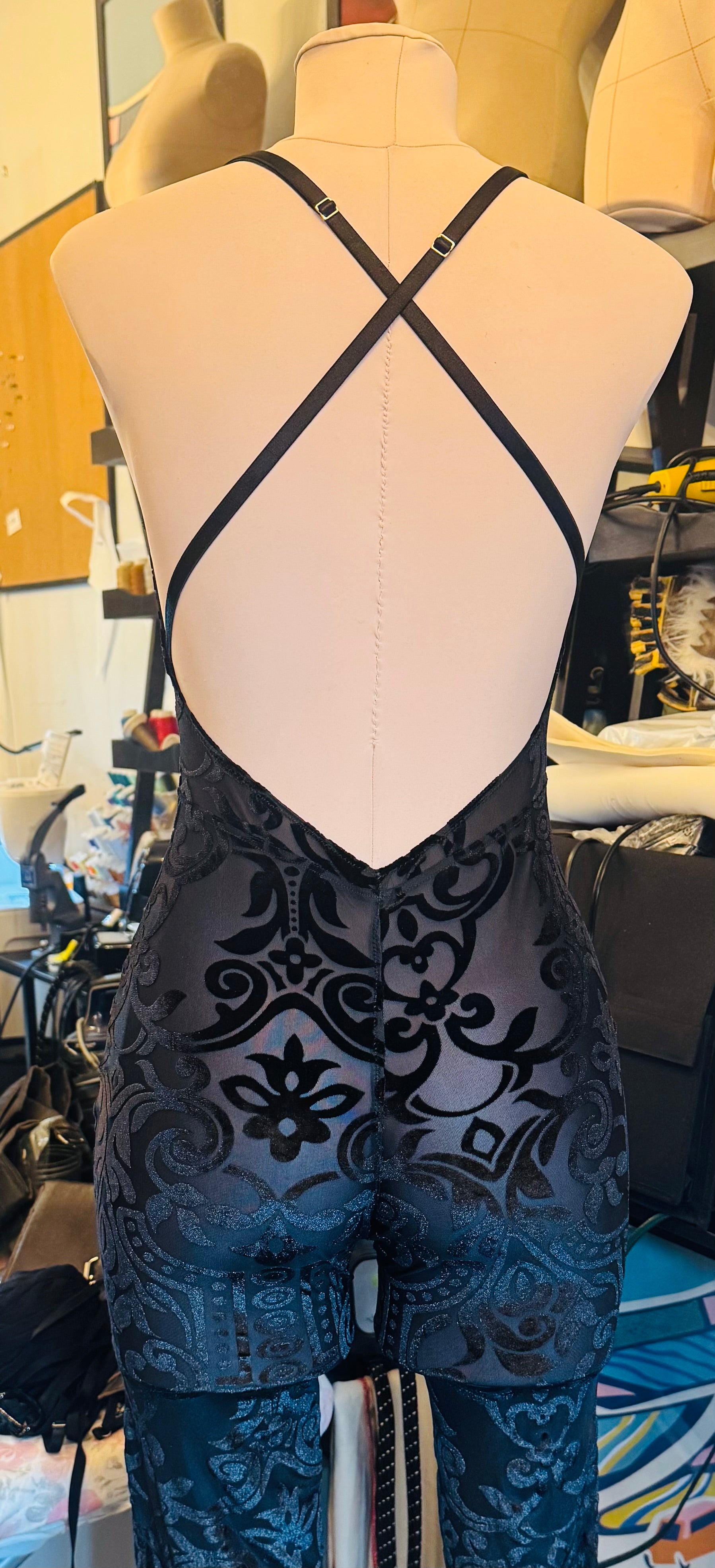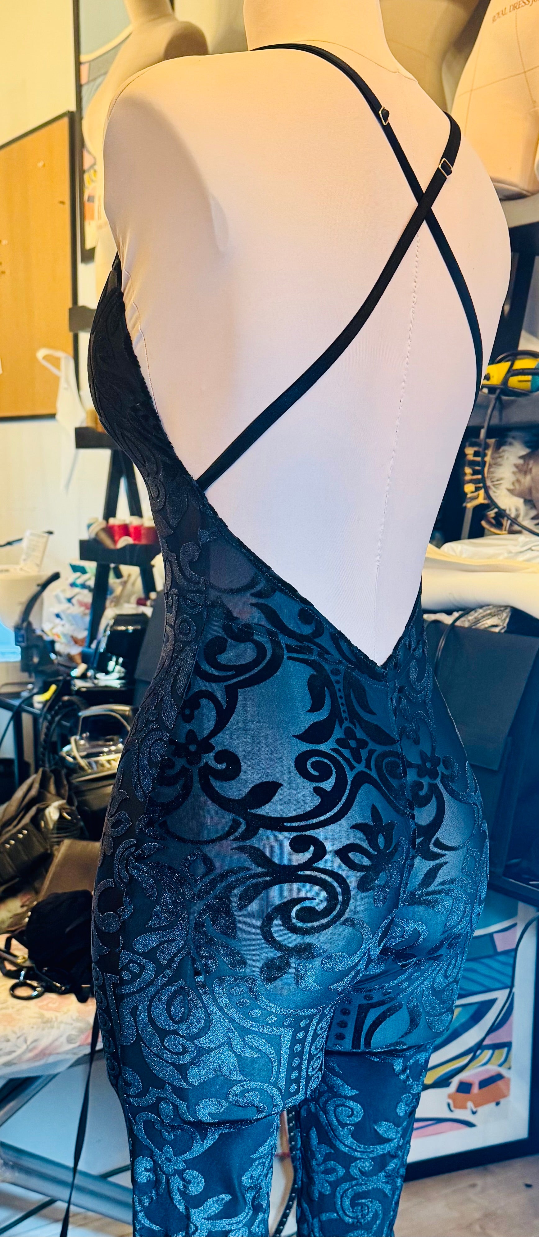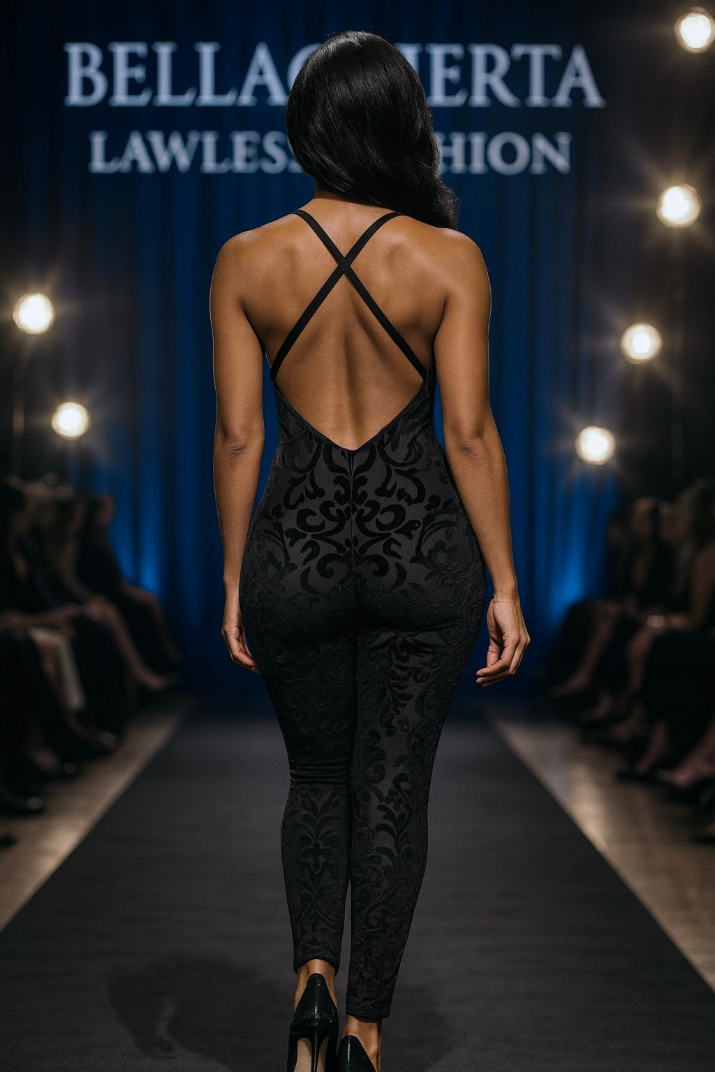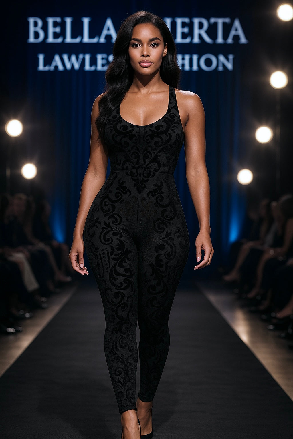 NOIR SCULPT by BelLacherta is a capsule dedicated to the art of the silhouette. Crafted from deep black velvet with bold baroque-inspired patterns, this body-sculpting jumpsuit embodies lawless elegance and unapologetic confidence. Designed to command attention under the lights, it merges couture craftsmanship with fearless energy. A creation born in Beverly Hills for women who don’t just walk the room — they own it.
